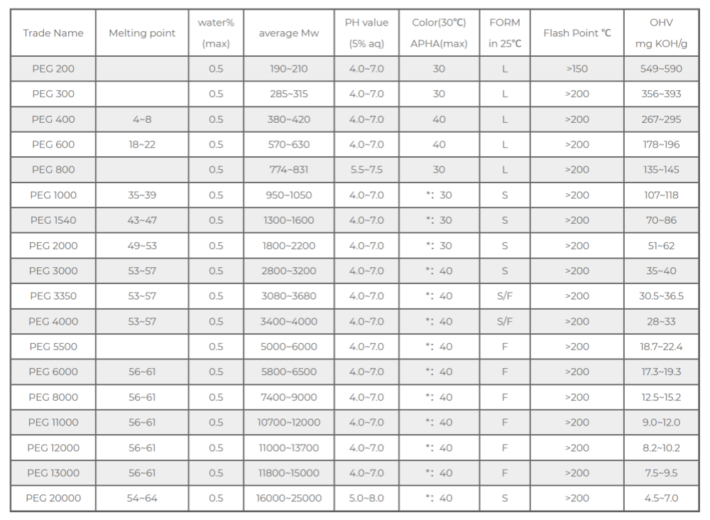 PEG-6000 et supra: Maximum hypotheticum pondus, durum solidum. Habet altiorem duritiem et punctum liquefaciens, et communiter usus est adiutorii metallici processus, tabulae ducatus vel textilis inspectionis agentis, praestantes lubricationes et dispersiones effectus praebens.